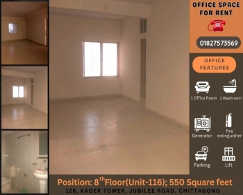 কাদের টাওয়ারের ৮ম তলায় অবস্থিত, ইউনিট নং: 116 550 বর্গফুট বিস্তৃত একটি আরামদায়ক কর্মক্ষেত্র প্রদান করে। এটিতে একটি অফিস রুম, একটি ওয়াশরুম এবং একটি রান্নাঘর রয়েছে যা এটিকে বিভিন্ন ব্যবসায়িক কার্যক্রমের জন্য উপযুক্ত করে তোলে।